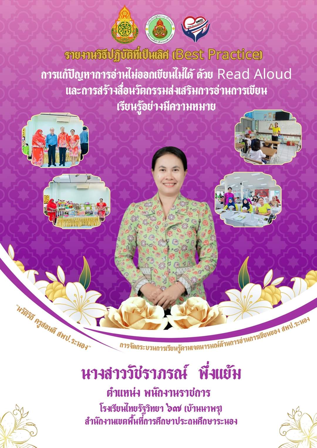 ????การเผยแพร่นวัตกรรม/วิธีปฏิบัติที่เป็นเลิศ (Best Practice) ????ชื่อผลงาน : การแก้ปัญหาการอ่านไม่ออกเขียนไม่ได้ ด้วย Read Aloud และการสร้างสื่อนวัตกรรมส่งเสริมการอ่านการเขียนเรียนรู้อย่างมีความหมาย ประเภทผลงาน ครูผู้สอนระดับประถมศึกษา การจัดกระบวนการเรียนรู้ตามเจตนารมณ์ด้านการอ่านการเขียนของ สพป.ระนอง ?????????????ผู้เสนอผลงาน : นางสาววัชราภรณ์ พึ่งแย้ม ตำแหน่ง พนักงานราชการ โรงเรียนไทยรัฐวิทยา ๖๗ (บ้านนาพรุ)