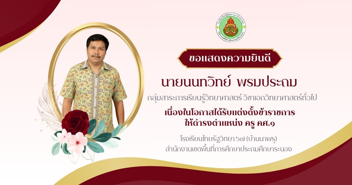 ขอแสดงความยินดีกับ คุณครูนนทวิทย์ พรมประถม เนื่องจากได้รับแต่งตั้งข้าราชการให้ดำรงตำแหน่งครู คศ.๑