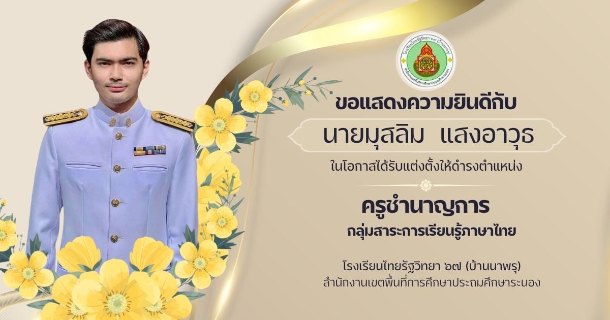 https://static.xx.fbcdn.net/images/emoji.php/v9/t8c/1/16/1f389.png" style="border:0px; height:16px; object-fit:fill; width:16px" />โรงเรียนไทยรัฐวิทยา ๖๗ (บ้านนาพรุ) ขอแสดงความยินดีกับ นายมุสลิม แสงอาวุธ เนื่องในโอกาสได้รับแต่งตั้งให้ดำรงตำแหน่ง ครูชำนาญการ กลุ่มสาระการเรียนรู้ภาษาไทย