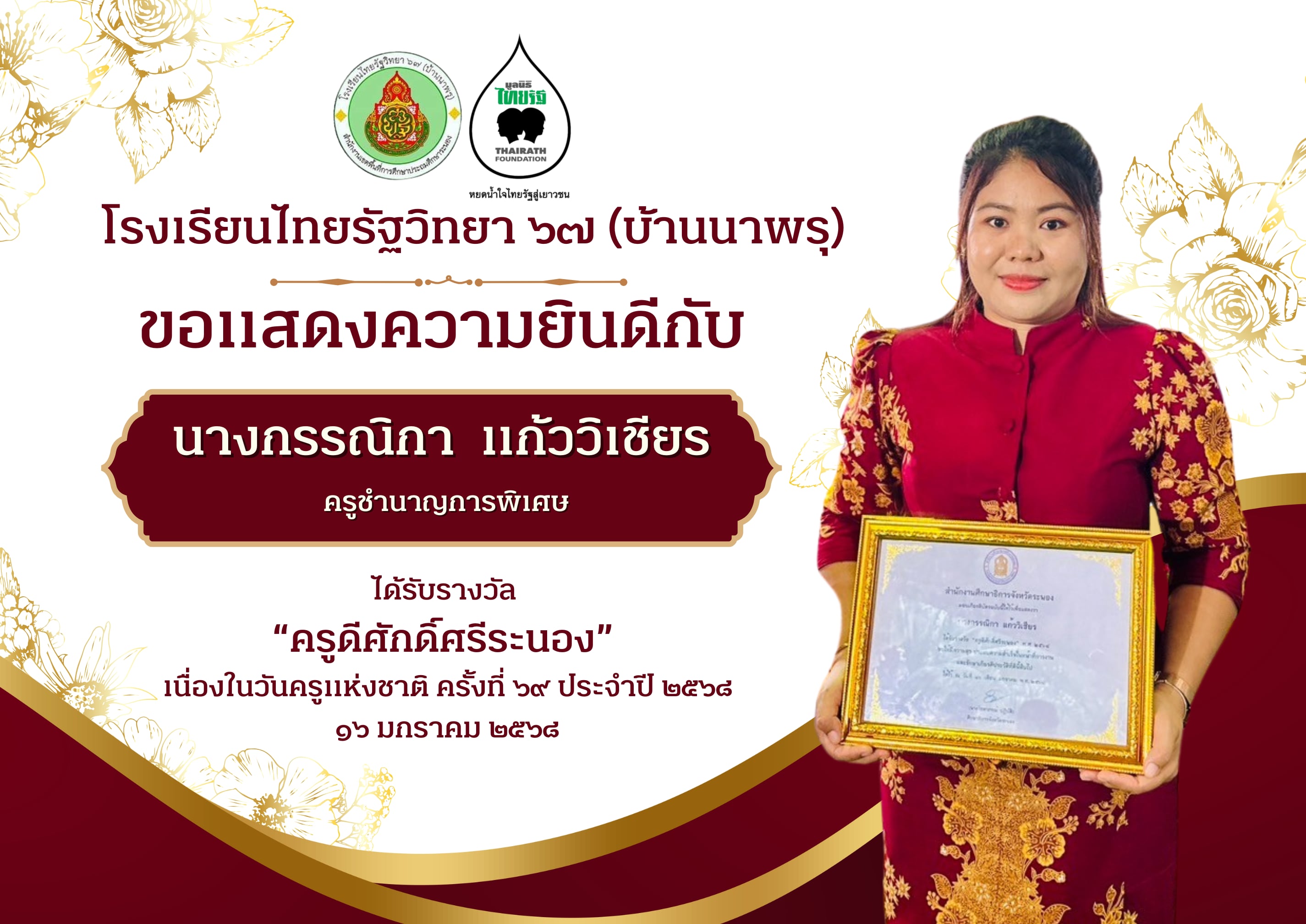 ????https://static.xx.fbcdn.net/images/emoji.php/v9/t3/1/16/1f380.png" target="_blank">https://static.xx.fbcdn.net/images/emoji.php/v9/t3/1/16/1f380.png" style="border:0px; height:16px; object-fit:fill; width:16px" />????https://static.xx.fbcdn.net/images/emoji.php/v9/t3/1/16/1f380.png" target="_blank">https://static.xx.fbcdn.net/images/emoji.php/v9/t3/1/16/1f380.png" style="border:0px; height:16px; object-fit:fill; width:16px" />โรงเรียนไทยรัฐวิทยา ๖๗ (บ้านนาพรุ) ขอแสดงความยินดีกับคุณครูกรรณิกา แก้ววิเชียร ครูชำนาญการพิเศษโรงเรียนไทยรัฐวิทยา ๖๗ (บ้านนาพรุ) เนื่องในโอกาสได้รับรางวัล "ครูดีศักดิ์ศรีระนอง" ในวันครูแห่งชาติ ครั้งที่ ๖๙ ประจำปี ๒๕๖๘?https://static.xx.fbcdn.net/images/emoji.php/v9/tf4/1/16/2728.png" target="_blank">https://static.xx.fbcdn.net/images/emoji.php/v9/tf4/1/16/2728.png" style="border:0px; height:16px; object-fit:fill; width:16px" />?https://static.xx.fbcdn.net/images/emoji.php/v9/tf4/1/16/2728.png" target="_blank">https://static.xx.fbcdn.net/images/emoji.php/v9/tf4/1/16/2728.png" style="border:0px; height:16px; object-fit:fill; width:16px" />