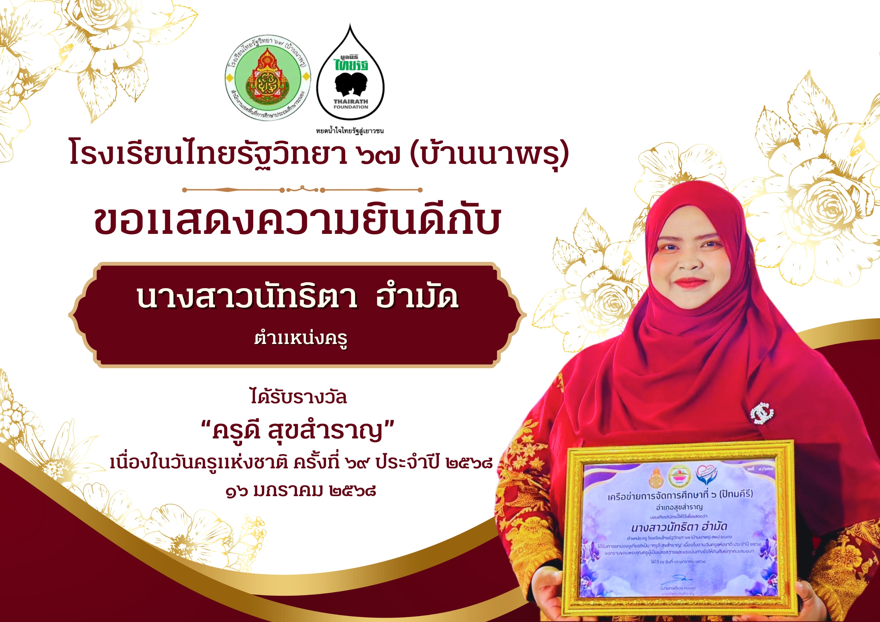 ????https://static.xx.fbcdn.net/images/emoji.php/v9/t3/1/16/1f380.png" target="_blank">https://static.xx.fbcdn.net/images/emoji.php/v9/t3/1/16/1f380.png" style="border:0px; height:16px; object-fit:fill; width:16px" />????https://static.xx.fbcdn.net/images/emoji.php/v9/t3/1/16/1f380.png" target="_blank">https://static.xx.fbcdn.net/images/emoji.php/v9/t3/1/16/1f380.png" style="border:0px; height:16px; object-fit:fill; width:16px" />โรงเรียนไทยรัฐวิทยา ๖๗ (บ้านนาพรุ) ขอแสดงความยินดีกับคุณครูนัทธิตา ฮำมัด ครูโรงเรียนไทยรัฐวิทยา ๖๗ (บ้านนาพรุ) เนื่องในโอกาสได้รับรางวัล "ครูดี สุขสำราญ" ในวันครูแห่งชาติ ครั้งที่ ๖๙ ประจำปี ๒๕๖๘?https://static.xx.fbcdn.net/images/emoji.php/v9/tf4/1/16/2728.png" target="_blank">https://static.xx.fbcdn.net/images/emoji.php/v9/tf4/1/16/2728.png" style="border:0px; height:16px; object-fit:fill; width:16px" />?https://static.xx.fbcdn.net/images/emoji.php/v9/tf4/1/16/2728.png" target="_blank">https://static.xx.fbcdn.net/images/emoji.php/v9/tf4/1/16/2728.png" style="border:0px; height:16px; object-fit:fill; width:16px" />