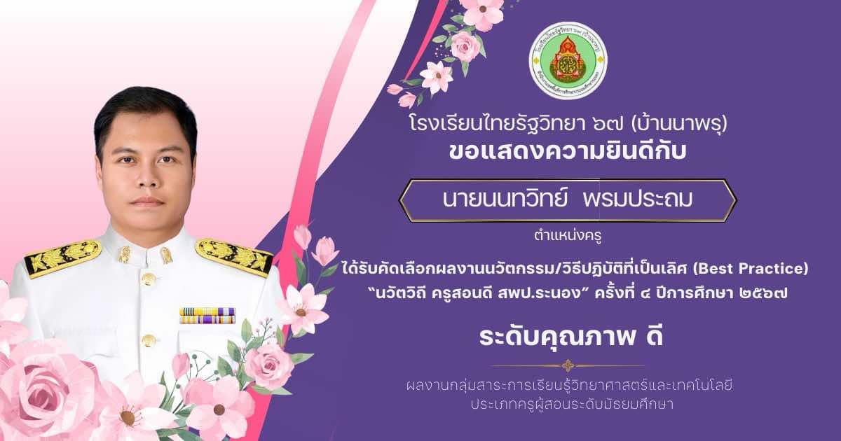 โรงเรียนไทยรัฐวิทยา ๖๗ (บ้านนาพรุ) ขอแสดงความยินดี กับ คุณครูนนทวิทย์ พรมประถม ตำแหน่งครู ได้รับคัดเลือกผลงานนวัตกรรม/วิธีปฏิบัติที่เป็นเลิศ (Best Practice) “นวัตวิถี ครูสอนดี สพป.ระนอง” ครั้งที่ ๔ ปีการศึกษา ๒๕๖๗ ระดับคุณภาพ ดี