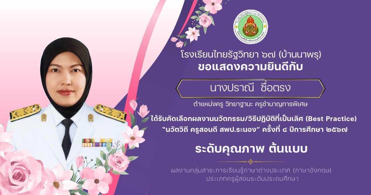 โรงเรียนไทยรัฐวิทยา ๖๗ (บ้านนาพรุ) ขอแสดงความยินดี กับ คุณครูปราณี ซื่อตรง ตำแหน่งครู วิทยฐานะ ครูชำนาญการพิเศษ ได้รับคัดเลือกผลงานนวัตกรรม/วิธีปฏิบัติที่เป็นเลิศ (Best Practice) “นวัตวิถี ครูสอนดี สพป.ระนอง” ครั้งที่ ๔ ปีการศึกษา ๒๕๖๗ ระดับคุณภาพ ต้นแบบ