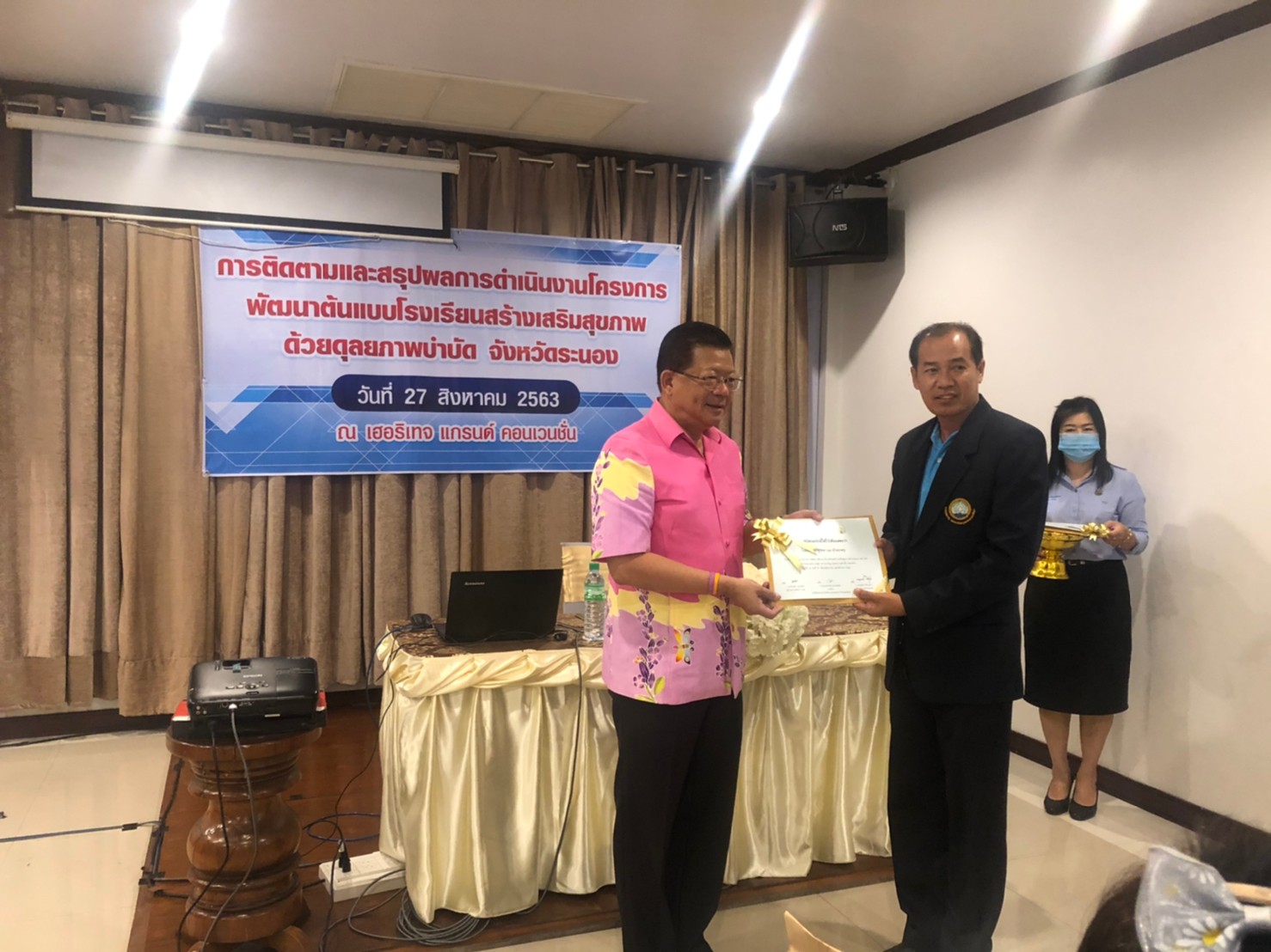 วันที่ 27 สิงหาคม 2563 นายสุภพ โพชนุกูล ผู้อำนวยการโรงเรียนไทยรัฐวิทยา ๖๗ (บ้านนาพรุ) พร้อมด้วยนางสุรัตติยา เหมทานนท์ ครูผู้รับผิดชอบโครงการพัฒนาต้นแบบโรงเรียนสร้างเสริมสุขภาพด้วยดุลยภาพบำบัด จังหวัดระนอง เข้าร่วมประชุมสรุปผลการดำเนินงานโครงการและรับมอบเกียรติบัตรโรงเรียนต้นแบบโครงการพัฒนาต้นแบบโรงเรียนสร้างเสริมสุขภาพด้วยดุลยภาพบำดับ จาก นายจตุพจน์ ปิยัมปุตระ ผู้ว่าราชการจังหวัดระนอง ณ โรงแรมการ์เด้น อำเภอเมือง จังหวัดระนอง
