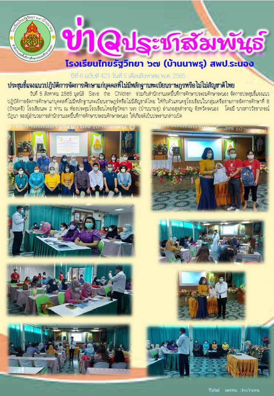 วันที่ 5 สิงหาคม 2565 มูลนิธิ Save the Children ร่วมกับสำนักงานเขตพื้นที่การศึกษาประถมศึกษาระนอง จัดการประชุมชี้แจงแนวปฏิบัติการจัดการศึกษาแก่บุคคลที่ไม่มีหลักฐานทะเบียนราษฎร์หรือไม่มีสัญชาติไทย ให้กับตัวแทนครูโรงเรียนในกลุ่มเครือข่ายการจัดการศึกษาที่ 6 (ปัทมครี) โรงเรียนละ 2 ท่าน ณ ห้องประชุมโรงเรียนไทยรัฐวิทยา ๖๗ (บ้านนาพรุ) อำเภอสุขสำราญ จังหวัดระนอง โดยมี นางสาววัชราภรณ์ ปัฏนา รองผู้อำนวยการสำนักงานเขตพื้นที่การศึกษาประถมศึกษาระนอง ให้เกียรติเป็นประธานกล่าวเปิด