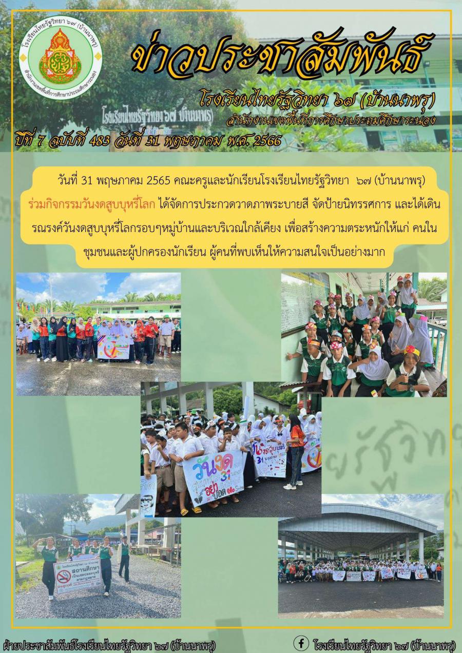 วันที่ 31 พฤษภาคม 2565 คณะครูและนักเรียนโรงเรียนไทยรัฐวิทยา ๖๗ (บ้านนาพรุ) ร่วมกิจกรรมวันงดสูบบุหรี่โลก ได้จัดการประกวดวาดภาพระบายสี จัดป้ายนิทรรศการ และได้เดินรณรงค์วันงดสูบบุหรี่โลกรอบๆหมู่บ้านและบริเวณใกล้เคียง เพื่อสร้างความตระหนักให้แก่ คนในชุมชนและผู้ปกครองนักเรียน ผู้คนที่พบเห็นให้ความสนใจเป็นอย่างมาก