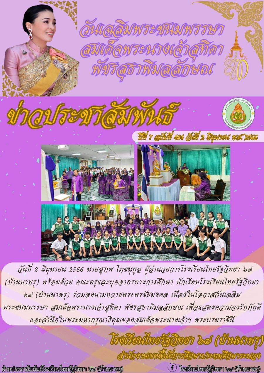 วันที่ 2 มิถุนายน 2566 นายสุภพ โภชนุกูล ผู้อำนวยการโรงเรียนไทยรัฐวิทยา ๖๗ (บ้านนาพรุ) พร้อมด้วย คณะครูและบุคลากรทางการศึกษา นักเรียนโรงเรียนไทยรัฐวิทยา ๖๗ (บ้านนาพรุ) ร่วมลงนามถวายพระพรชัยมงคล เนื่องในโอกาสวันเฉลิมพระชนมพรรษา สมเด็จพระนางเจ้าสุทิดา พัชรสุธาพิมลลักษณ เพื่อแสดงความจงรักภักดีและสำนึกในพระมหากรุณาธิคุณของสมเด็จพระนางเจ้าฯ พระบรมราชินี