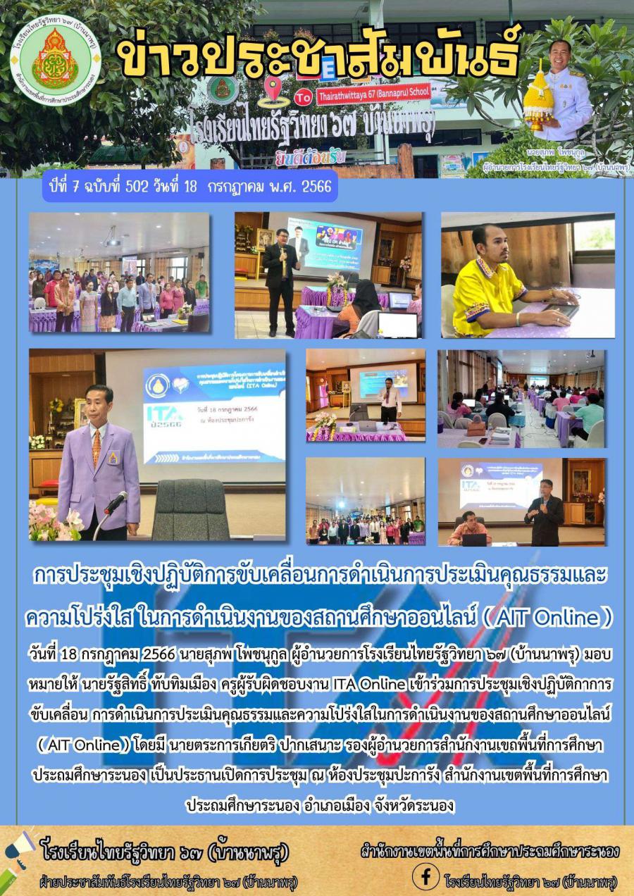 ฉบับที่ 502/2566 การประชุมเชิงปฏิบัติการขับเคลื่อนการดำเนินการประเมินคุณธรรมและความโปร่งใส ในการดำเนินงานของสถานศึกษาออนไลน์ ( AIT Online )