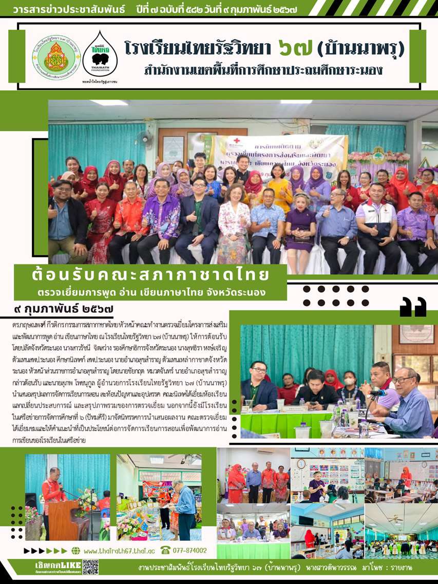 ดร.กฤษณพงศ์ กีรติกร กรรมการสภากาชาดไทย หัวหน้าคณะทำงานตรวจเยี่ยมโครงการส่งเสริมและพัฒนาการพูด อ่าน เขียนภาษาไทย ณ โรงเรียนไทยรัฐวิทยา ๖๗ (บ้านนาพรุ) นายสุภพ โพชนุกูล ผู้อำนวยการโรงเรียนไทยรัฐวิทยา ๖๗ (บ้านนาพรุ) นำเสนอสรุปผลการจัดการเรียนการสอน สะท้อนปัญหาและอุปสรรค คณะนิเทศได้เยี่ยมห้องเรียนแลกเปลี่ยนประสบการณ์ และสรุปภาพรวมของการตรวจเยี่ยม