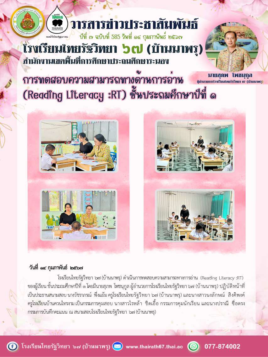 โรงเรียนไทยรัฐวิทยา ๖๗ (บ้านนาพรุ) ดำเนินการทดสอบความสามารถทางการอ่าน (Reading Literacy :RT)