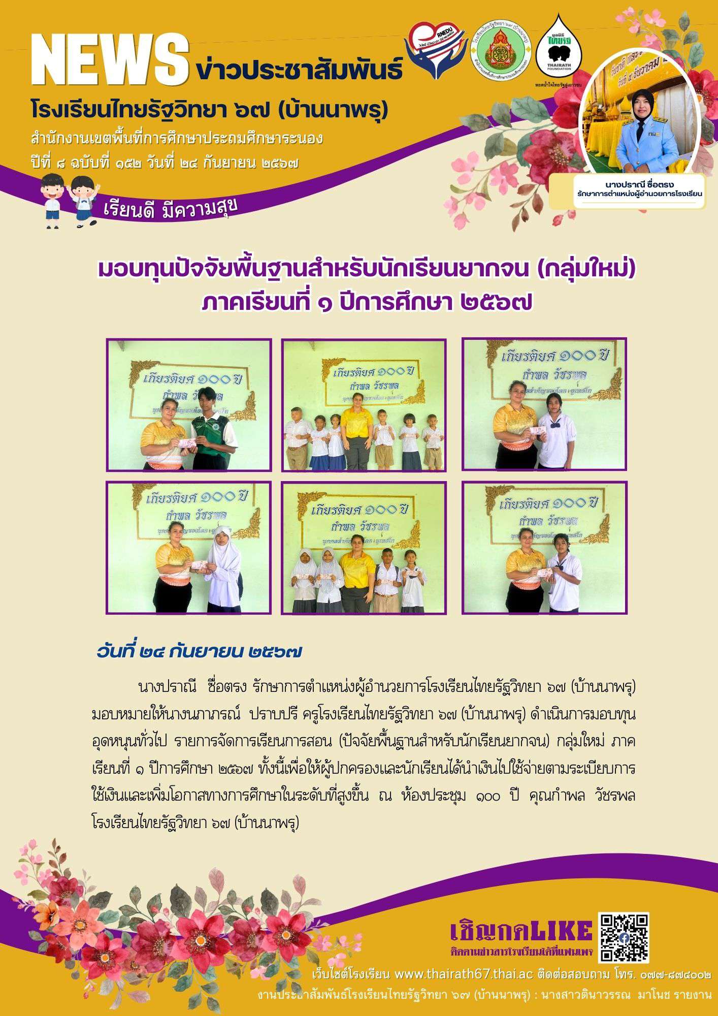 ปีที่ ๘ ฉบับที่ ๑๕๒ มอบทุนปัจจัยพื้นฐานสำหรับนักเรียนยากจน (กลุ่มใหม่) ภาคเรียนที่ ๑ ปีการศึกษา ๒๕๖๗